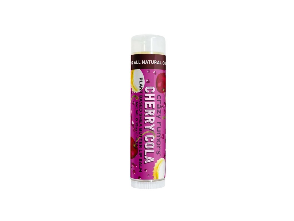 Balzám na rty Cherry Cola Crazy Rumors s obsahem změkčujícího bambuckého másla, ochranného makadamiového a zjemňujícího jojobového oleje. S příchutí višňové Coca Coly. Ručně vyráběný balzámek s čistým veganským složením a vymazlenou texturou. Díky vitaminu E a přírodním voskům chrání, hydratuje a vyživuje.